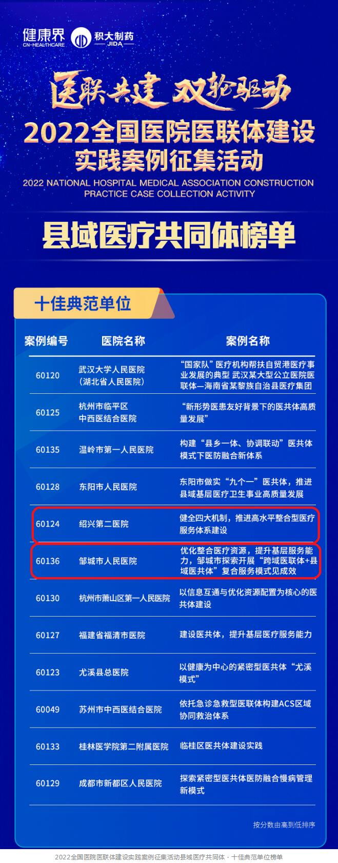 近日,由中国医院协会医疗联合体工作委员会指导、健康界主办的“2022全国医院医联体建设实践案例榜单”正式揭晓,经过激烈的线上PK演讲,华卓合作客户——绍兴第二医院、邹城市人民医院凭借各自项目在217个案例中脱颖而出,均荣获“县域医疗共同体十佳典范单位”奖。
