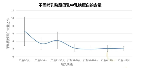 产后0-5天,母乳中乳铁蛋白含量最高,平均值为6.63g/L,随着哺乳天数的增加,乳铁蛋白含量逐渐下降,产后一个月,乳铁蛋白含量维持在一个相对平稳的值,大约在2.0-2.5 g/L之间。都说初乳“赛黄金”正是因为初乳中乳铁蛋白含量最高,对小婴儿的保护性作用最强。