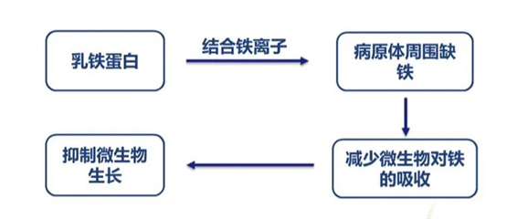 乳铁蛋白能高度结合铁,使细菌失去生长所需的基本元素铁,减少微生物对铁的吸收,抑制微生物生长。体外和动物研究发现,乳铁蛋白对多种革兰氏阳性和革兰氏阴性致病菌呈现抑菌活性,并具有抑制诺瓦克病毒复制和抑制念珠菌增殖的功能。(Jahani S, et al. 2015)