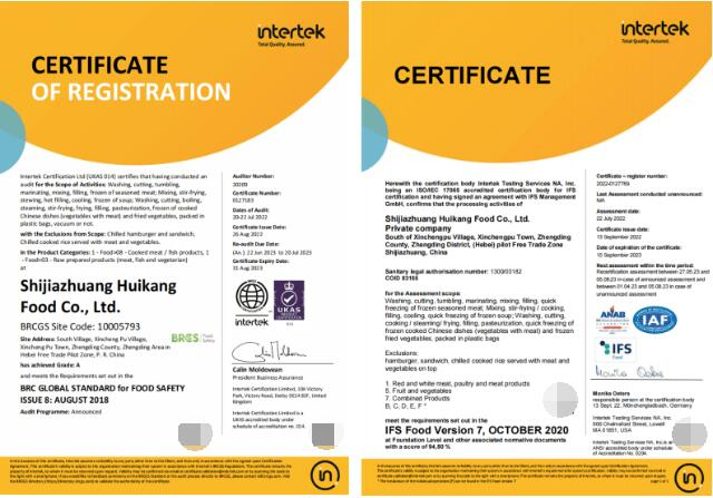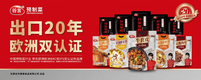 2022年9月,石家庄市惠康食品有限公司通过了欧洲BRC(食品安全全球标准)认证和IFS(国际食品标准)认证,这也是中国预制菜行业率先通过欧州双认证的企业。