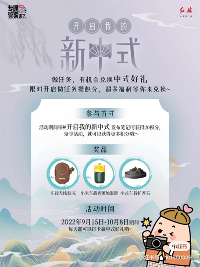 9月15日起,在小红书搜索话题#开启我的新中式 完成相关任务获得积分,就有机会兑换车载无线快充、香薰加湿器、扩香石等惊喜好礼。不仅如此,搜索话题词、浏览相关笔记并进行互动,还能触发由全新红旗H5提供的惊喜盒子。