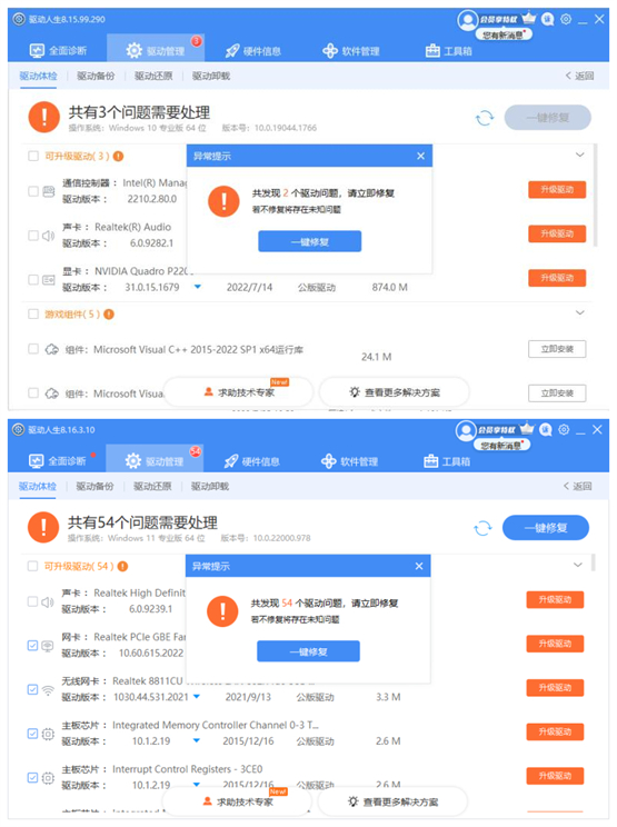 如下图所示,在升级深度扫描功能前,只能检测出两个驱动问题;在升级后,可检测出54个问题。
