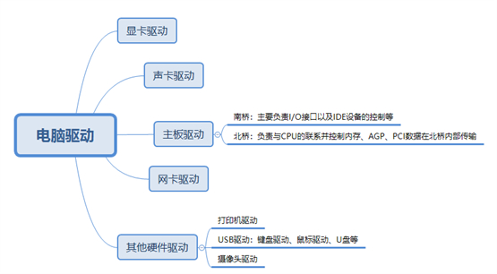 电脑中的驱动可以分为主板驱动、显卡驱动、声卡驱动、网卡驱动等,如果是笔记本电脑还会有键盘驱动、鼠标驱动、无限网卡驱动等。