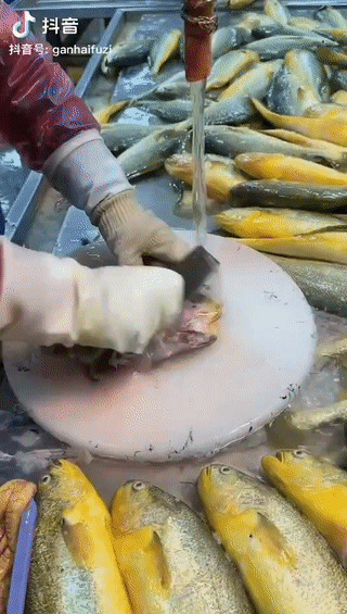 水一直开着,阿姨用专门的小刀,划开新鲜黄鱼的肚子,迅速刮去内脏。