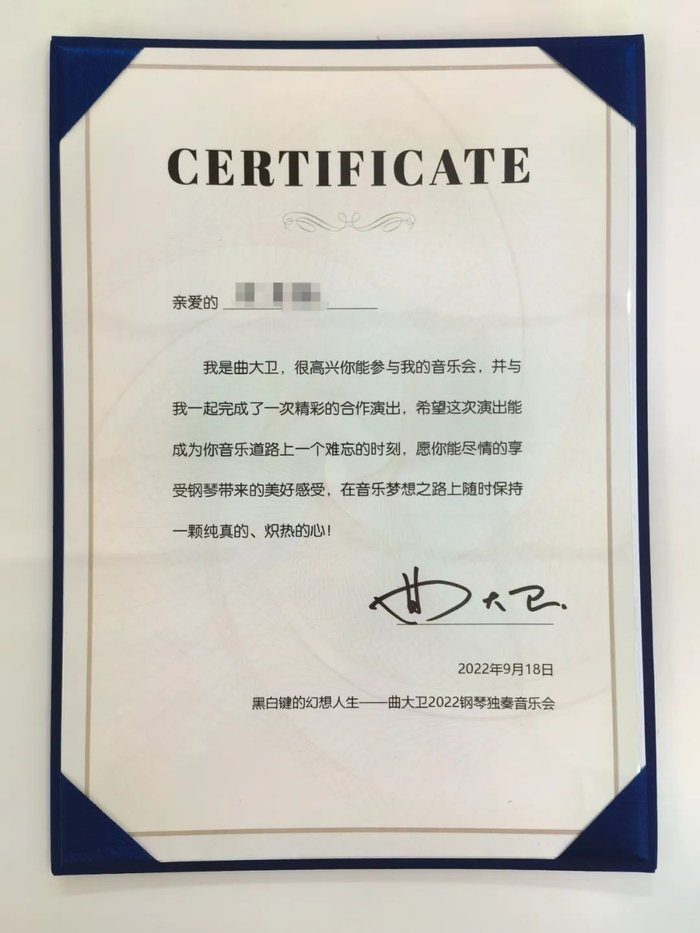 音乐会结束,为孩子们送上了印有琴童名字的演奏家亲笔签名证书,特此留念,希望琴童们带着演奏家的美好祝福,在音乐梦想之路上随时保持一颗纯真、炽热的心!