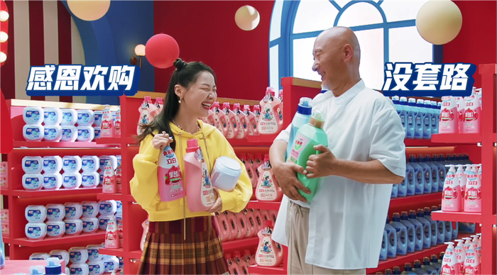 在创意内容上,立白瞄准喜剧内容赛道,选择了已经合作了2次的喜剧大师陈佩斯,再搭档新生代喜剧人——金靖,在大打回忆杀、情怀牌的同时,也凸显出立白的与时俱进。广告情景以超市促销场景,将主角二人拉入消费者生活的日常,集赞、满减门槛、加群、留信息,这些让消费者苦不堪言的营销套路,在二人实力表演逐级传达中土崩瓦解,营造出一种引人入胜的无套路购物情景。