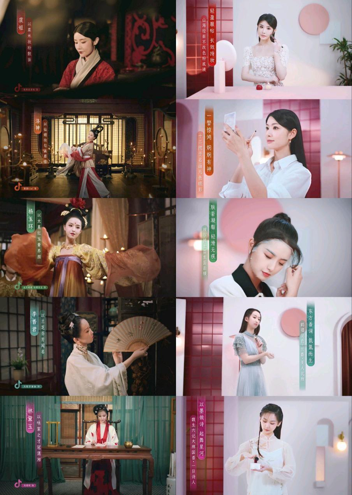 如杨玉环以太真红玉膏养颜,瑷尔博士益生菌面膜 也能帮助用户肤若凝脂、轻滑无痕;虞姬以粟米妆粉敷面,与国货美妆品牌山海经面不改色粉底液 的轻盈服帖、长效持妆相契合;洛神以仙娥妆勾画眉眼,正如十二院子名画九色眼影 ,一瞥惊鸿、炯炯有神;鹤禧觉色·兰麝 · 美人优雅 产品的东方香调,恰如以兰芝芬芳闻名李香君;馥生六记大牌国香 ·一日诗人, 让人想起林黛玉以咏絮之才冠潇湘。