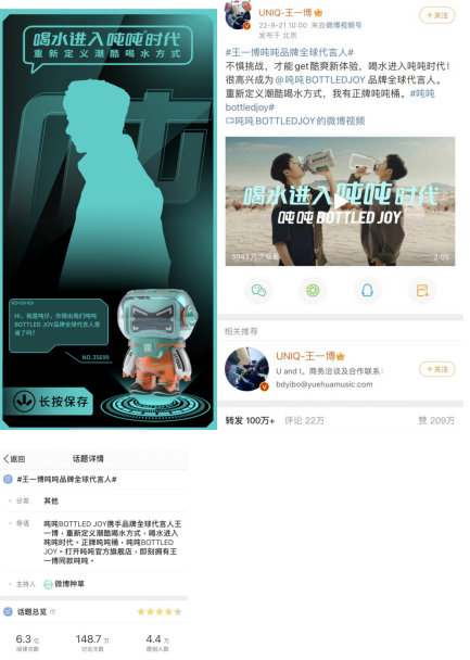 源于改善大众健康饮水的初心和情怀,吨吨BOTTLED JOY专注健康水具16年,从OEM到OBM,从走红海外到国内上亿曝光,品牌这些厚积薄发、乘风破浪的点点滴滴与从出道至今王一博的经历高度契合。两者的缘分早在王一博参加综艺《这就是街舞4》,吨吨BOTTLED JOY不离身时就埋下了。在代言人官宣预热阶段,吨吨BOTTLED JOY互动H5惊喜上线,点燃用户打卡热情,首日突破10万人次点击。在官宣TVC中,吨吨BOTTLED JOY与代言人王一博一起重新定义潮酷喝水方式,播放量突破3000万,艺人微博转发量超100万。微博话题#王一博吨吨品牌全球代言人#冲上热搜,当日即斩获了超过6亿的阅读量,突破140万讨论数,引发全域关注。