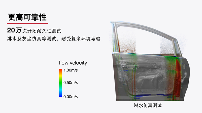 除此之外,全系侧门锁产品都经过一系列严格测试,保证门锁作为关键车辆部件的高稳定和可靠性。例如,产品通过高于行业要求一倍的20万次开闭耐久性测试,并经过淋水及灰尘仿真等测试,能耐受复杂环境考验。