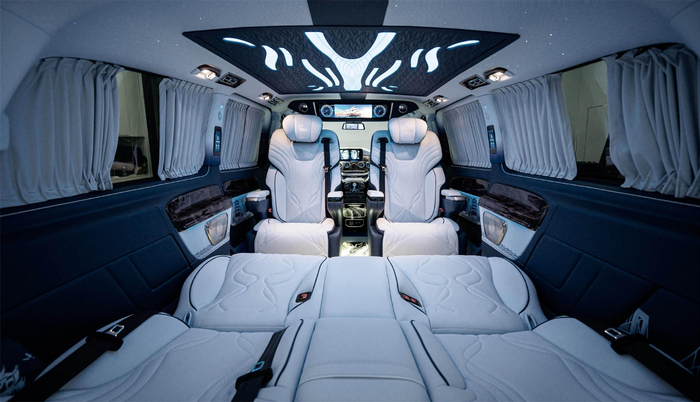 威霆作为商务车改装领域的主打车型在本次大赛中也有很多出色的改装案例。来自武汉的酷卡驰商改以湖北的大江大湖为主题,以水为元素进行整合设计,采用湖水蓝为主色,将水纹用作个性冲孔,将分片以流动线条的形式把座椅面重新分割,将水元素更加充分的呈现在整车内饰中,两条主灯带以长江和汉水交汇原型复制。