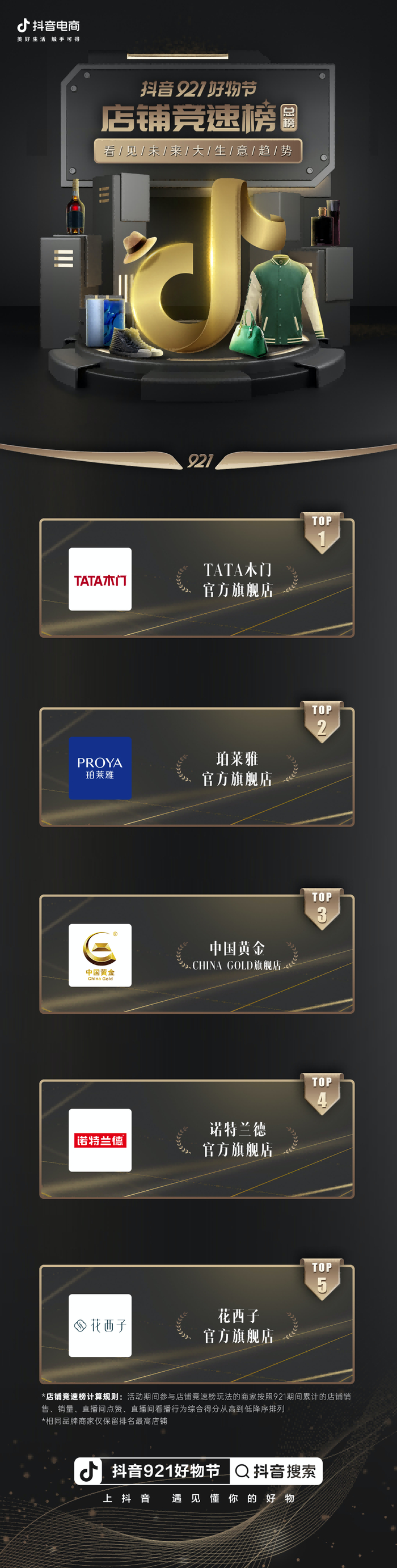 根据店铺销售额/店铺销量/直播间互动等综合因素排序,TATA木门官方旗舰店、珀莱雅官方旗舰店、中国黄金CHINA GOLD官方旗舰店、诺特兰德官方旗舰店、花西子官方旗舰店登上“抖音921好物节店铺竞速榜总榜”TOP5位置。