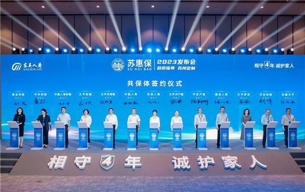 “苏惠保2023”在苏州市政府支持下升级回归,由苏州市医保局、市财政局、市国资委、市人社局、市民政局、市卫健委、市金融监管局、市大数据管理局、银保监分局、市医保中心、市社保中心共同指导,东吴人寿主承保,中国人寿苏州市分公司、太平洋产险苏州分公司、太平洋寿险苏州分公司、平安产险苏州分公司、太平财险苏州分公司、建信人寿苏州分公司、中国人寿财险苏州公司、太平养老苏州分公司、中华保险苏州中心支公司、天安财险苏州中心支公司、紫金保险苏州中心支公司、安盛天平苏州中心支公司联合承保,苏州市民卡共同承办。