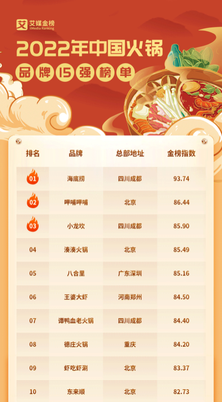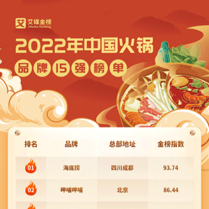 日前,iiMedia Ranking(艾媒金榜)最新发布《2022年中国火锅品牌15强榜单》,海底捞以93.74的金榜指数摘得桂冠。