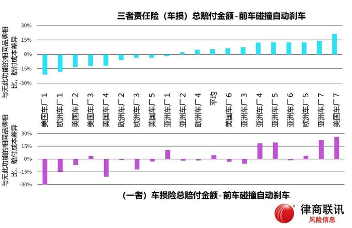 为进一步解释自动刹车安全功能反而会增加事故风险,律商风险分析了不同车厂的前车碰撞自动刹车系统分别对事故风险的影响。如上图所示,不同车厂的自动刹车系统对于事故风险的影响千差万别,有的车厂自动刹车系统可以非常有效地降低三者和一者车辆事故风险。更多的车厂自动刹车系统反而提高了事故风险。原因在于过于“主动”的自动刹车系统,养成了车主的过度依赖性,从而开车更加鲁莽,更加容易出事故。