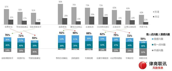 吕博士表示:“调研结果表明,对于事故自动响应、道路救助、车辆检测等服务,有一点兴趣和很感兴趣的人占比都高达80%以上。而对于车险的理赔助手、保费折扣、以及4S店维保通知、车辆定位等服务,有一点兴趣和很感兴趣的人占比也都达到70%以上。”