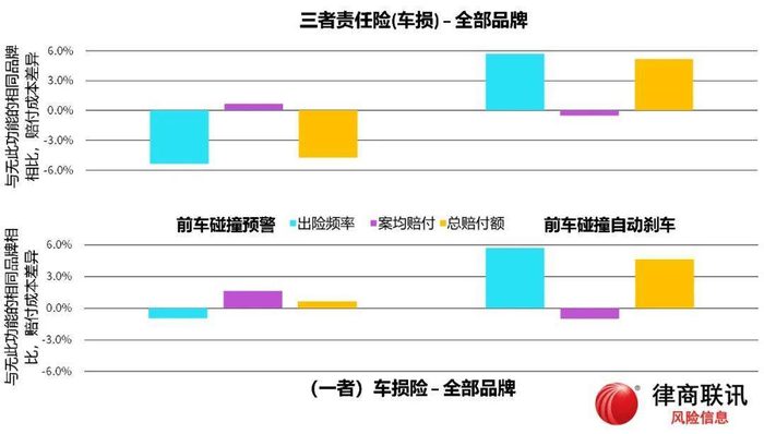 上图显示,防范前车碰撞风险的两个实现机制中,前车碰撞预警对于降低三者车损效果显著,但是对于一者车损基本没有效果。很可能部分原因在于得到预警后,车主来不及刹车,宁愿把车开到马路牙子上也要避免撞车。相比而言,通过自动刹车机制来防范前车碰撞,从所有品牌视角笼统地看,不但没有降低,反而增加了三者和一者车辆的事故风险。