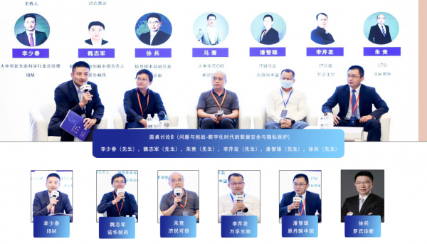 接下来的圆桌讨论环节的参与嘉宾有IBM大中华区生命科学行业总经理李少春 (先生)、诺华制药数据管理与创新小组负责人魏志军 (先生)、罗氏诊断信息技术部副总裁徐兵 (先生)、原丹瑞中国IT总监潘智雄 (先生)、万孚生物IT总监李芹发 (先生)、济民可信CIO朱竞 (先生)。嘉宾们就数据产生价值的过程中会产生怎样的问题,药企要求、数据安全法、本土药企和跨国药企的最佳实践、围绕数字化、技术和医药、器械领域流通等方面给出了自己独特的见解。现场其他嘉宾的精彩提问也让讨论更加精彩,与会嘉宾们受益颇丰。