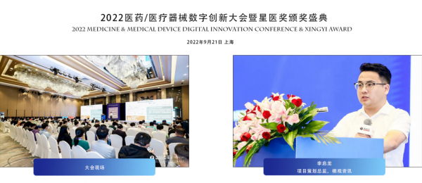 由栖观资讯和飞羽商务主办的“2022医药&医疗器械数字创新大会暨星医奖颁奖盛典”于2022年9月21日在上海扬子江丽笙精选酒店三楼宴会厅隆重举行。现场嘉宾为来自国内外一线医药、医疗器械行业的CEO、CIO、CMO,IT总监、市场总监等信息化负责人与药械产业优秀信息化解决方案服务商等300余人。特别感谢本次活动的协办机构:「蜂向圈」 、「灼识咨询」 。支持机构「思齐圈」 、「美栢医健」 对此次活动的大力支持。此次大会还得到「脉络洞察」 、「国科恒兴」 、「denodo」 、「健康通」 、「医药大脑」 、「蓝凌软件」 、「清贇科技」 、「易快报」 、「上直播」 、「纷享销客」 、「翼方健数」 、「爱特曼」 、「论客」 、「杉数科技」 、「惠每科技」、「群杰物联」、「源资科技」、「阿康云医」 的赞助支持。