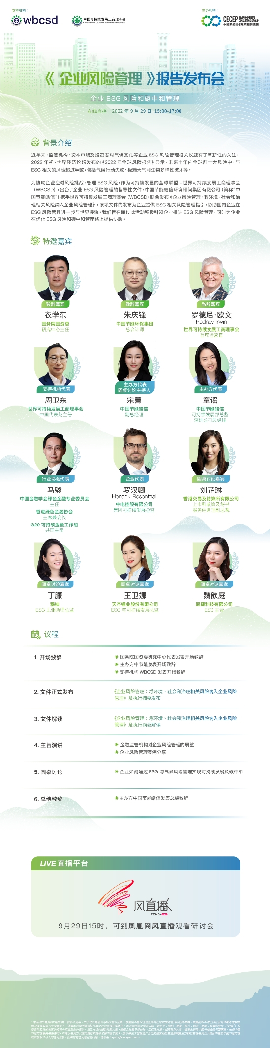 为了促进指南在大中华区的推广及应用,COSO和WBCSD于2021年委托中国节能皓信环境顾问集团有限公司(“中国节能皓信”)进行指南简体中文版的翻译。该版本已完成并即将在9月29日透过线上研讨会发布;研讨会的主题为“《企业风险管理》报告发布会:企业ESG风险和碳中和管理”,届时将对指南进行解读,并就企业ESG风险管理和碳中和等相关议题提供深入的指导。