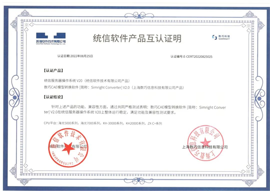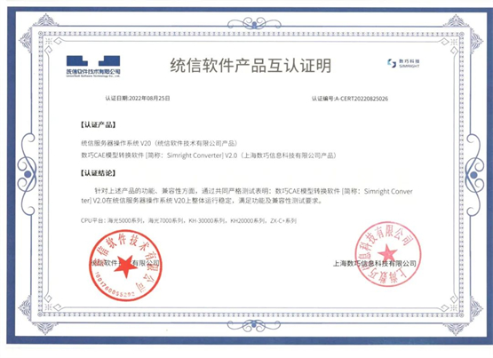数巧CAE模型转换软件[简称:Simright Converter]V2.0与统信服务器操作系统V20 E版本适配互认证明