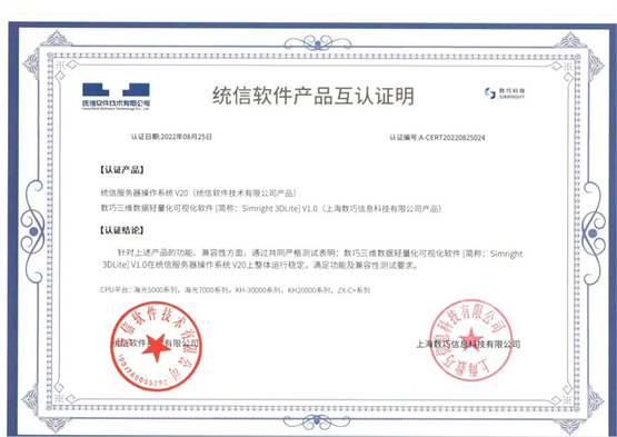 数巧三维数据轻量化可视化软件[简称:Simright 3DLite]V1.0与统信服务器操作系统V20 A版本适配互认证明