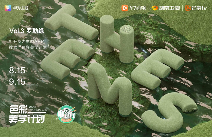此次色彩美学计划与《中餐厅6》合作的主题色为「罗勒绿」:低饱和度的高级质感、自带纯净、疗愈的生命力,与《中餐厅6》这一季 “回归自然,绿色、有机治愈感”的基调不谋而合。基于此,华为主题特别打造了以「罗勒绿」为主色调的特色专区,不仅聚合了色调一致的主题、表盘、壁纸,还巧妙融入《中餐厅6》的节目视频、品牌logo、创意海报,满屏生机盎然的绿意让人仿佛让人置身于自然中,享受山野林间的有机气息。