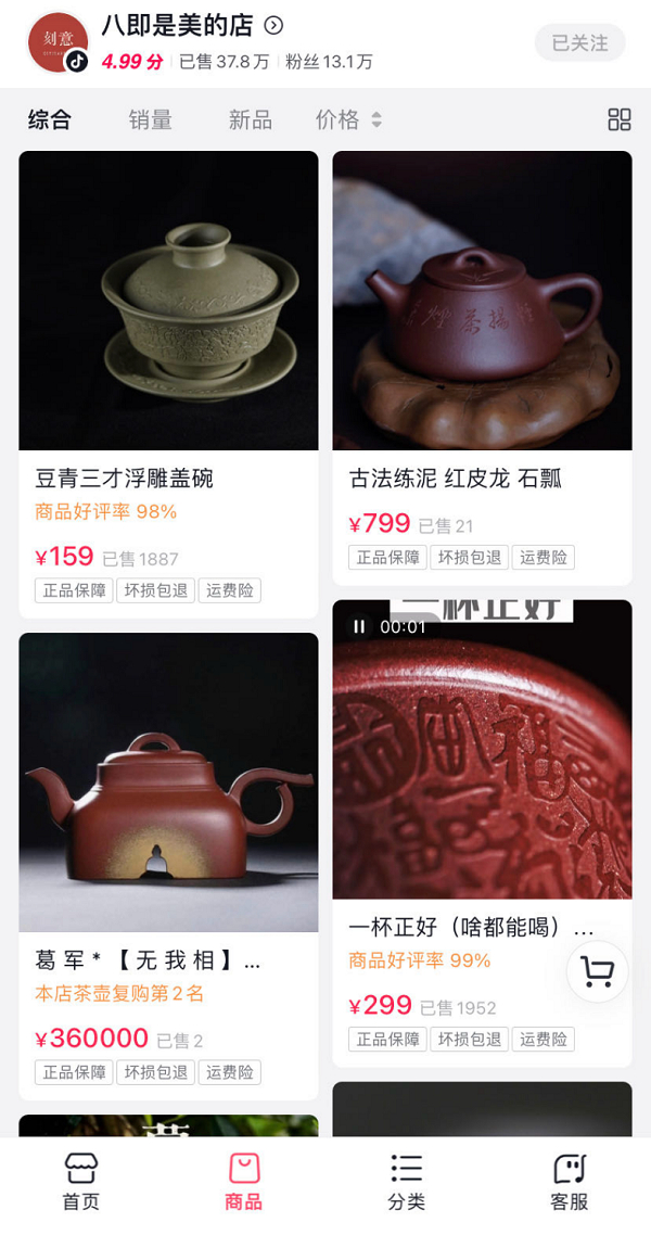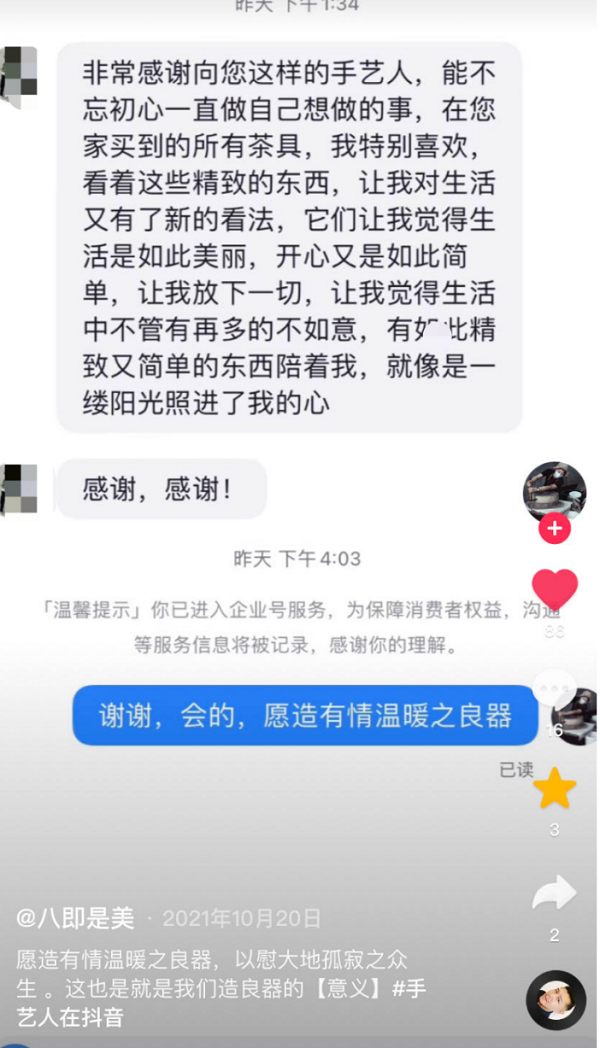 如今,「八即是美」的抖音电商越做越红火,保持着高复购高好评,近两年间卖出了37.8万件茶具,粉丝也超过了13.1万人。