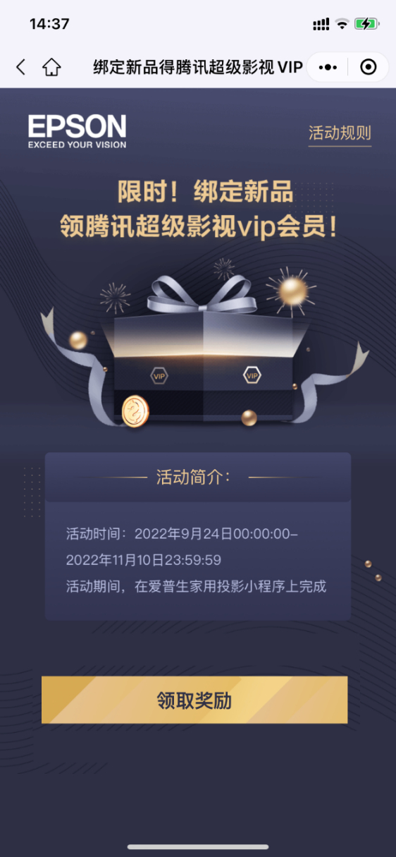 用户在注册会员成功后,若绑定爱普生9月所发布的爱普生CO-FH02、CH-A100、CH-TW6250T、EH-LS800W/B、CH-TW6280T任意一款家用投影机新品,可立即获得价值50元的腾讯超级影视VIP 月卡。奖品超赞,福利众多,你还不心动吗?