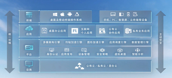 ● 传输加速引擎。桌面云协议VDP5.0 是改善用户体验的核心力量。在采用了更加智能的算法和技术后,办公带宽降低至100Kbps,操作时延从80毫秒降至40毫秒,桌面分辨率从4K提升至8K,帧率提升至144帧 ,为用户带来云上云下一致的使用体验。另外,通过最新的英特尔TCI透明终端架构 技术,可以实现桌面秒级切换、系统极速启动、镜像增量更新、应用配置保留、终端离线 可用等诸多特性,极大地提升桌面管理效率。