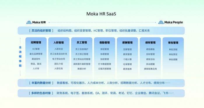 2020年底,基于对客户需求的深入洞察,Moka推出了全员好用的智能化人力资源管理系统——Moka People。该系统能覆盖企业的组织人事管理、假期考勤管理、薪酬管理、绩效管理、人力数据分析等人力资源高频业务场景,通过对业务场景的深入把握和数据洞见,为企业提供更科学的管理助力。