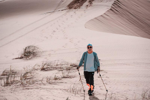 休息间隙,提及这几天徒步戈壁沙漠的感触,黎京雄院长的兴致很高:“沙漠徒步,前期挑战的是体力,后期挑战的是耐力,后面两天,体力和耐力都到达了临界点。这个时间点很微妙,全身的细胞都想要放弃,但是心里清楚,跨过去,就是新境界。”