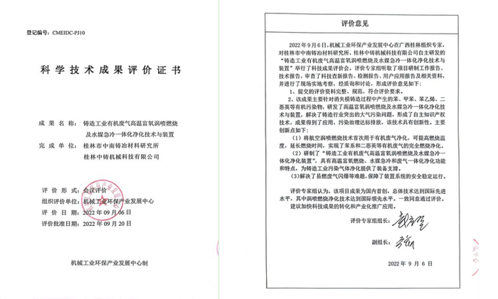 近日,由机械工业环保产业发展中心组织专家组到访桂林,对桂林市中南铸冶材料研究所、桂林中铸机械科技有限公司自主研发的“铸造工业有机废气高温富氧涡喷燃烧及水媒急冷一体化净化技术与装置”举行了科技成果评价会。