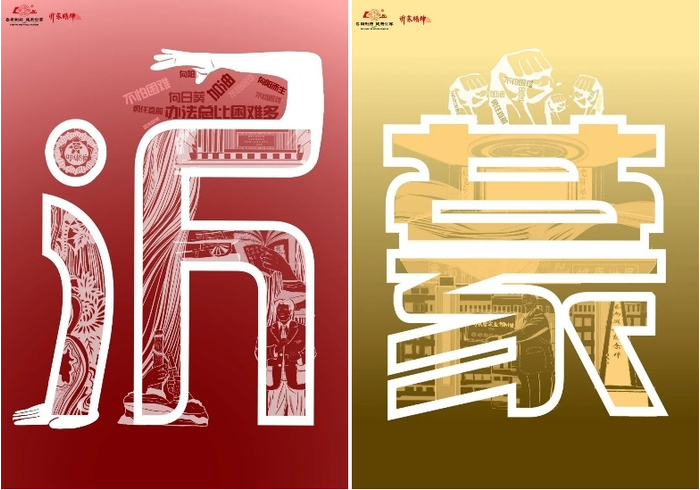 沂蒙精神所拥有的是精神内涵,因此在沂蒙两个字的内部进行了非常细致的沂蒙新时代精神描绘,包括新时代鲁南精神和赵志全精神的重要事件。第一幅整体构图为人,表现不怕困难、向阳而生、向前奋进的新时代沂蒙精神。第二幅体现了沂蒙精神在不断进步之中,不断打破常规奋斗拼搏意涵。