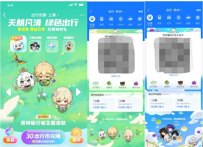 此次原神与支付宝的跨界合作,是米哈游在绿色公益领域的一次新尝试。在本月22日开启的“天朗风清,绿色出行”主题活动中,全国的支付宝用户可通过参与绿色出行活动,免费兑换支付宝平台内的原神主题出行皮肤、限量原石及周边抽奖等奖励;本次活动也联合了多城公交地铁企业,在上海、杭州、广州、武汉等多个城市推出原神绿色出行主题公交车、地铁、共享单车,鼓励用户选择低碳出行方式。