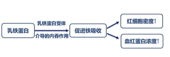 乳铁蛋白能通过肠细胞表面的乳铁蛋白受体介导的内吞作用促进铁吸收,摄入铁饱和乳铁蛋白能显著增加体内红细胞密度和血红蛋白浓度。(Gislason J, et al.1995)