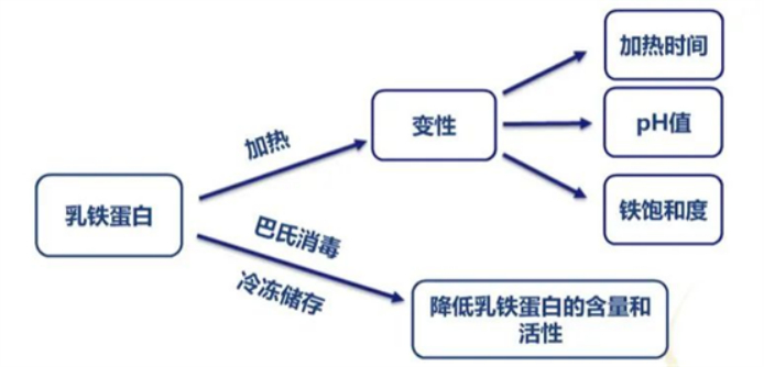 乳铁蛋白在加热时会发生不同程度的变性,变性程度主要与加热时间、pH值和铁饱和度等相关,巴氏消毒以及冷冻储存等手段都会在一定程度上降低乳铁蛋白的含量和活性。只有经过过滤、超滤预处理,利用阳离子交换层析分离纯化、冷冻干燥后得到的乳铁蛋白才能更大程度地保留其活性。(LÖnnerdal B, et al. 2011)