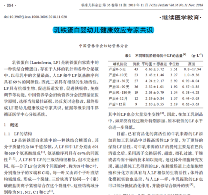 2018年11月,中国营养学会妇幼营养分会发布《乳铁蛋白婴幼儿健康效应专家共识》(以下简称《乳铁蛋白共识》),这是中国营养学会妇幼营养分会首次发布针对婴幼儿喂养中有关功能性食物成分的建议。