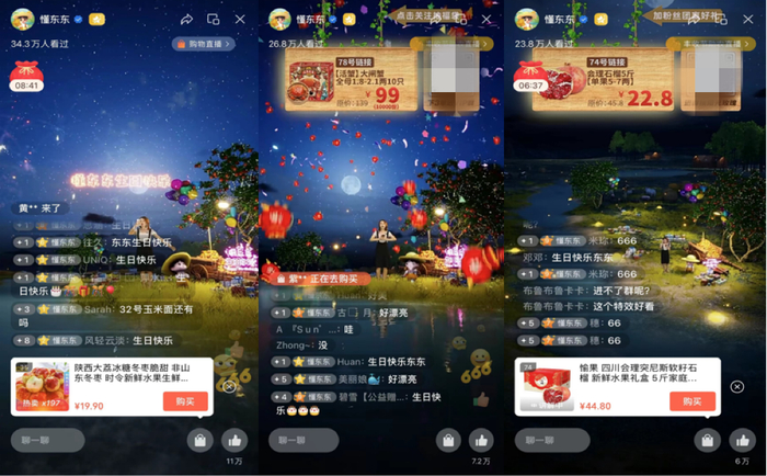 在9月23日落脚宿迁与武功,开展了一场横跨两地、虚拟与现实交汇的跨时空直播,单场实现观看人数破33w,销售额同比去年增长30倍+,单场售出超15万枚陕西周至猕猴桃、3万多只大闸蟹,6000多枚会理石榴。成绩喜人的同时,邀请宿迁市湖滨新区皂河镇闫集村支部书记闫辉,全国劳动模范、全国农村青年致富带头人潘裴等政府及新农人代表做客直播间,通过镜头展示霸王蟹从养殖、捕捞到捆绑、打包的全流程,直播过程融入当地特有的舞狮、苏北大鼓等民俗表演,全方位多角度展现宿迁大闸蟹的丰收场面。
