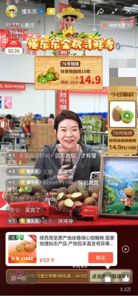 西北最大产地智能供应链中心的京东陕西智能供应链中心,去年落户武功县。在溯源直播之外,本次京东农特产购物节,懂东东微信视频号联合京东物流,亲临武功县首次开展物流仓库直播,让消费者感受从源地快速送达的优质服务,品尝到汁多肉嫩、酸甜适度、清香可口的武功猕猴桃。