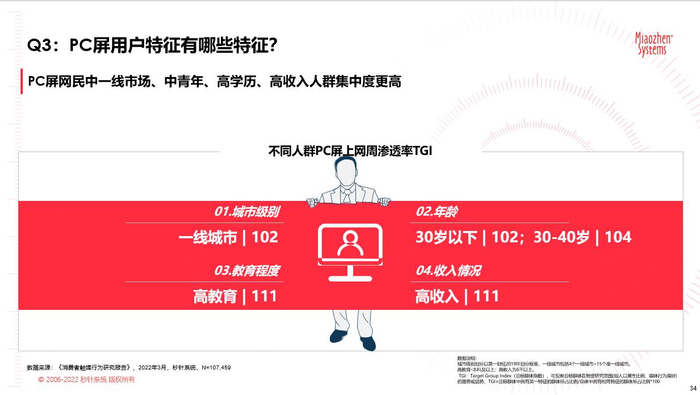 在PC出货量增长,PC流量价值回归的背景下,秒针基于1000位PC屏用户定量调研,深度刻画了用户画像和行为偏好。调研显示,PC屏网民以一线市场、中青年、高学历、高收入人群为主,可以说PC屏聚集了消费能力高、消费意愿强的高净值用户,对广告主具有很高的营销价值。
