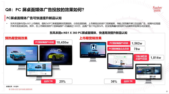 作为PC桌面媒体的典型代表—360PC锁屏画报也为行业带来了诸多优质的营销案例,为广告主品牌营销提供了更多新思路。例如,东风本田新车型e:NS1上市期间,借助360PC屏桌面媒体资源矩阵,分别在预热期、上市期组合投放PC锁屏画报,导航/浏览器开屏以及品直广告,短期内实现提升新车知名度目标,在实现高曝光的同时为品牌带来较高互动及留资。