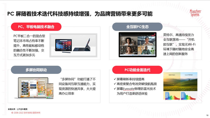除了PC端用户使用规模不断上升之外,PC设备也随着技术迭代不断升级进化。PC平板电脑技术融合让移动性、便携性更强,PC功能全面迭代使设备更具操控性和体验感,全互联PC生态的建成,多屏互联互通实现资源的快速共享,大大提高了办公效率。设备的革新在提升用户体验的同时,也为品牌营销带来了更多可能。