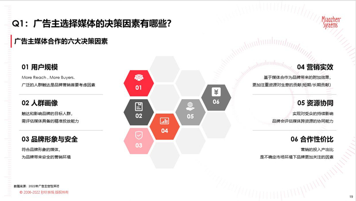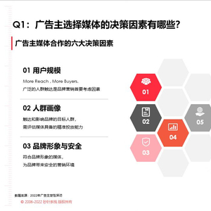 随着技术的发展,媒介渠道越来越多元,用户注意力和用户时长也逐渐碎片化,在有限的市场预算里,如何选择高效的媒体平台和广告类型成为品牌主需要考虑的重要问题。在秒针发布的新洞察报告里,将用户规模、人群画像、品牌形象与安全、营销实效、资源协同、合作性价比 归纳为广告主媒体合作关键因素,广告主将基于以上六点来综合评估和选择媒体平台。
