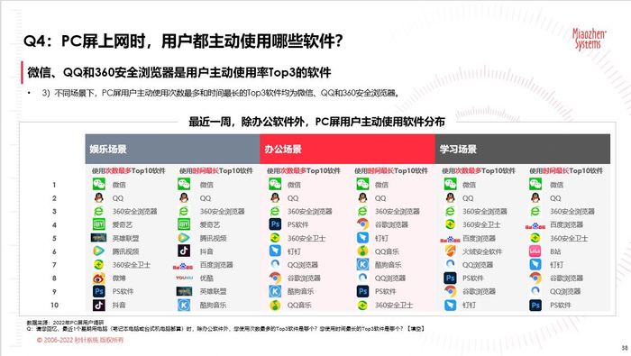 PC屏全面覆盖用户的娱乐、办公、学习场景三大核心场景, 用户每天平均使用PC屏时长达到5小时,是日常接触时间最长的屏端。在用户不同使用场景中,PC屏用户主动使用次数最多和时间最长的Top3软件均为微信、QQ和360安全浏览器。
