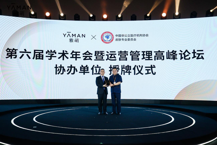 雅萌品牌在技术突破和医研共创道路上的成长离不开皮肤医学界临床工作者的指导支持,以及与行业知名医疗机构的紧密合作。中国非公立医疗机构协会皮肤专业委员会主任委员、复旦大学附属华山医院资深教授郑志忠教授代表中国非公立医疗机构协会皮肤专委会在峰会发表致辞,并作为中国非公立医疗机构协会皮肤专业委员会代表为雅萌授予中国非公立医疗机构协会皮肤专业委员会第六届学术年会暨运营高峰论坛协办单位感谢牌。