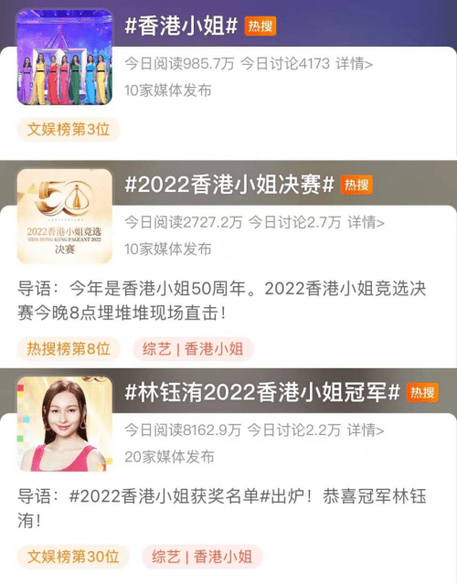 由TVB主办的一年一度香港小姐竞选决赛昨晚隆重举行,全网刷屏。大热选手林钰洧、许子萱、梁超怡获得三甲殊荣,更让人激动的是历届港姐现身舞台掀起怀旧回忆杀,还有天王黎明以及草蜢乐队惊喜亮相、《声梦传奇》学员登台表演,共同助阵港姐夺冠。当晚,多个相关话题登上全网各大平台热搜榜单,受到网民热烈讨论。