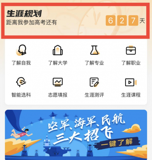移动端进入升级改版后的【生涯规划】,不难看到“距离我参考高考还有xxx天”的字样。升学e网通期望通过高考时间具象化的方式,让高中学子意识到时间的宝贵,从而激发目标感,促进学生更加有序地进行高中日常规划,展开合理的时间管理与目标管理。