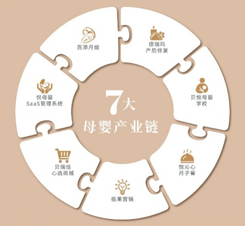 贝悦母婴集团布局月子会所加盟的全产业链体系,整合7大产业(悦母婴SaaS管理系统、贝悦母婴学校、百添月嫂、德瑞玛产后康复、贝瑞佳心选商城、悦沁心月子餐、极果营销),致力于打造“行业领先的全产业链母婴服务平台”。
