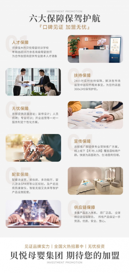 并基于全产业链的优势,给予月子会所加盟一体化的扶持保障:例如月子会所加盟最关心的开店选址;人才保障;运营扶持;配套保障;供应链保障;获客营销等。
