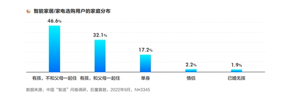 根据巨量算数调研,相对单身人士而言,选购智能家居/家电更多为家庭用户,其中“有孩子不和父母住”的用户占比高达46.6%,而“有孩子和父母一起住”的用户也超过30%。